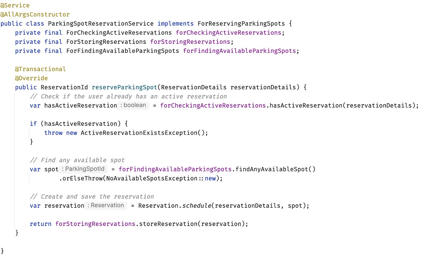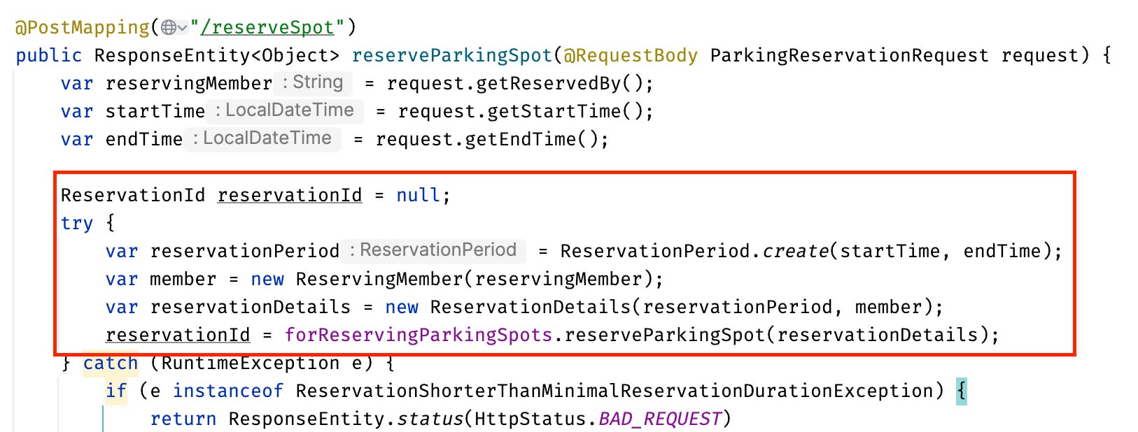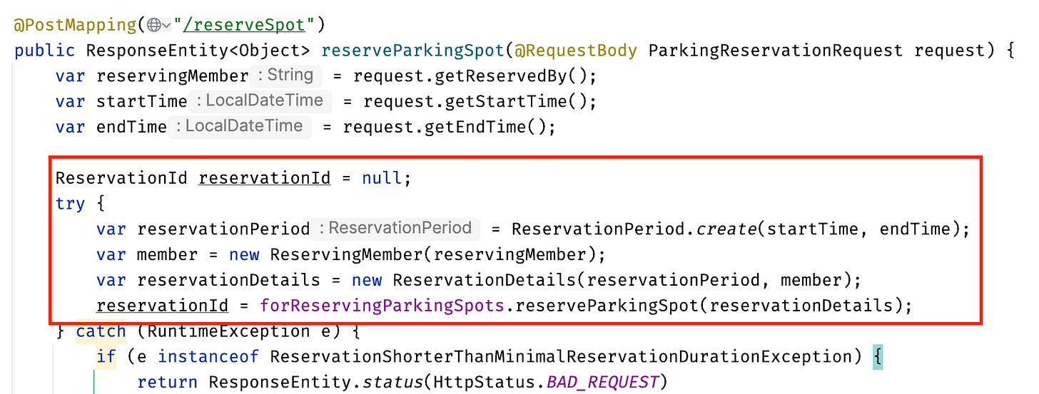 Alternatively, we could think about simply passing the three parameters startTime, endTime, and reservingMember as primitive types into the port again and moving the creation of ReservationDetails into the port-implementing service. Again, this leads to the Data Clump code smell described in an earlier article.