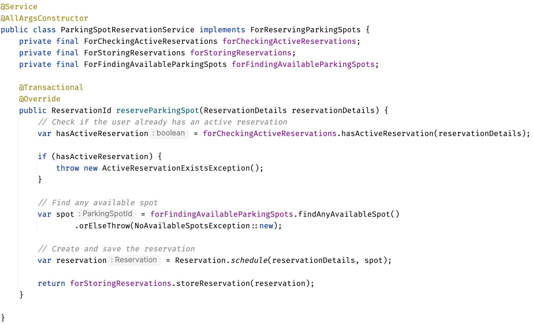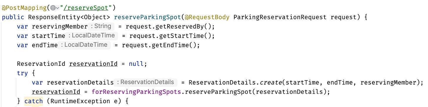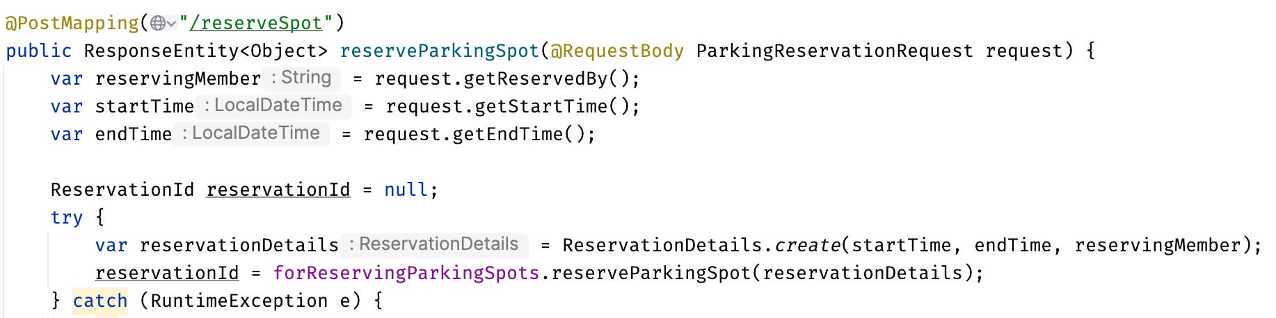We could also have saved one translation step if we used the presentation concern’s request DTO inside the ForReservingParkingSpots port, but then we would again have had the application concern depend on the presentation concern, which we want to avoid for several reasons discussed in earlier articles.