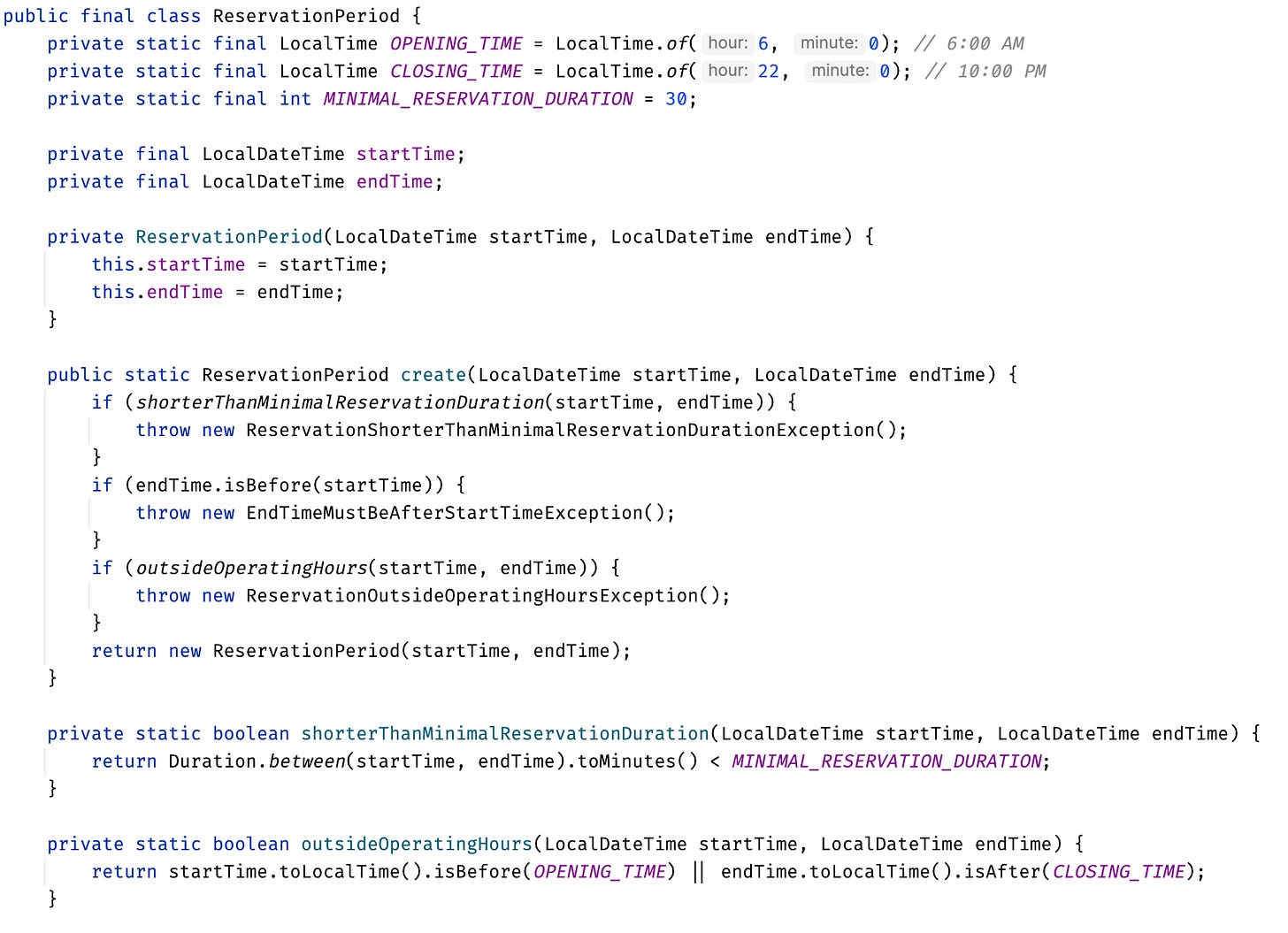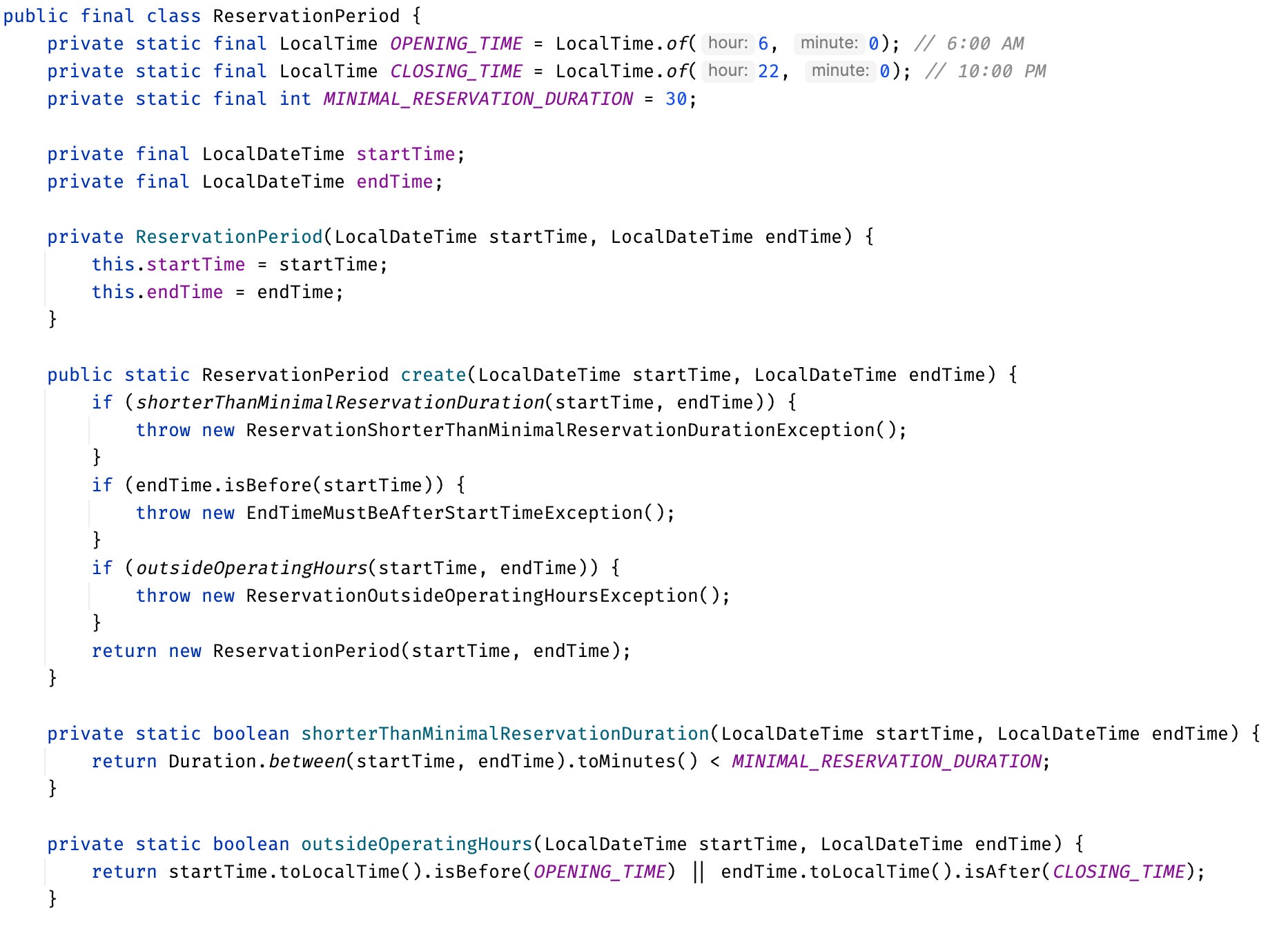 This piece of logic does not require and additional call to another system and can be done completely in isolation. All it does is accessing the ReservationPeriod’s startTime and endTime. It is therefore a great candidate to be moved into the actual ReservationPeriod class.