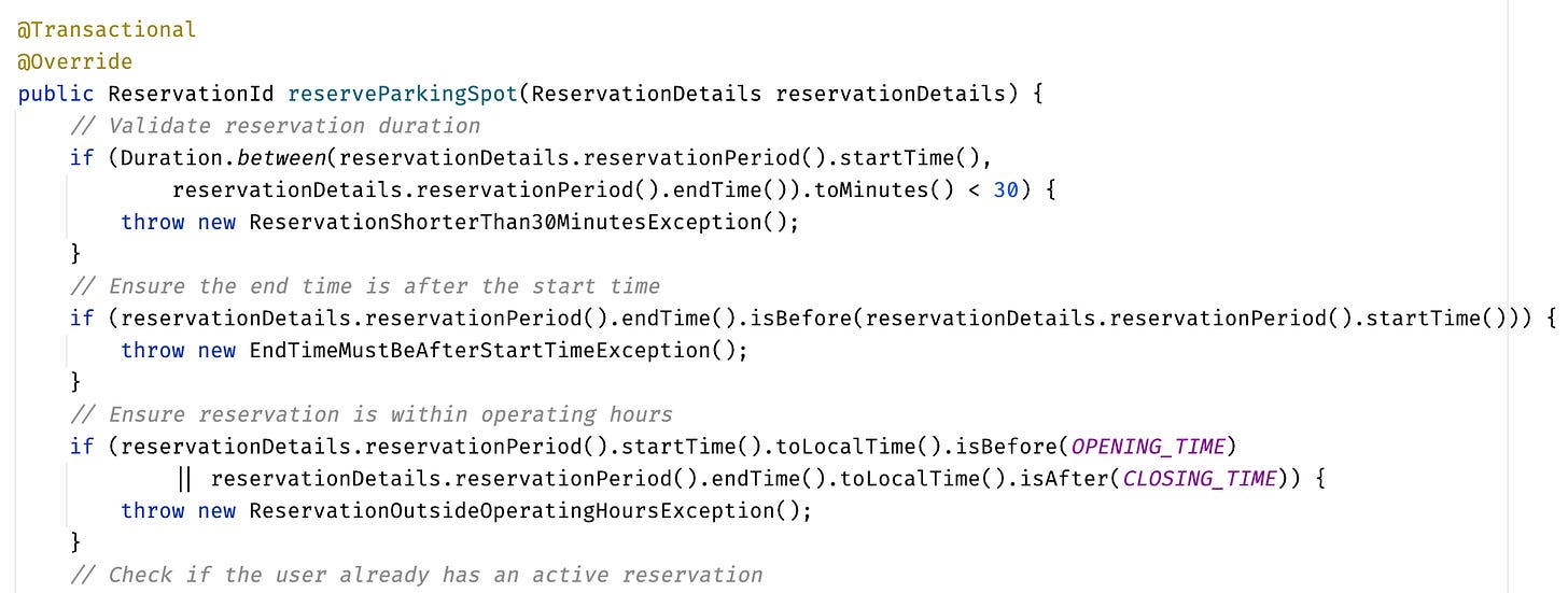 We see a lot of logic to ensure that the ReservationPeriod is in a valid state before we can process the reservation request any further.